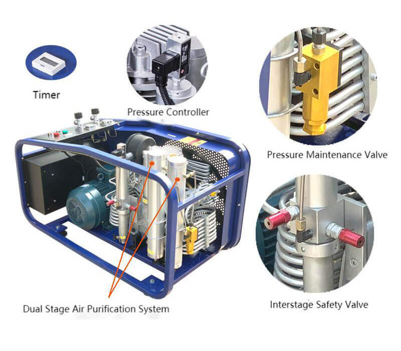 Этот продукт производится серийно после модернизации и оптимизации по итальянской конструкции. Поршень последней ступени изготовлен по специальной технологии, поршневые кольца изготовлены по японской технологии Riken, а все литьё производится на специализированных крупных заводах, что заслужило широкое признание пользователей. Этот продукт использует трёхцилиндровую систему, трёхступенчатую компрессию, систему смазки разбрызгиванием, межступенчатый предохранительный клапан и систему фильтрации. SLT-300 способен обеспечить безопасный сжатый воздух для любой отрасли, где требуется источник чистого воздуха высокого давления, гарантирующий безопасность дыхания.