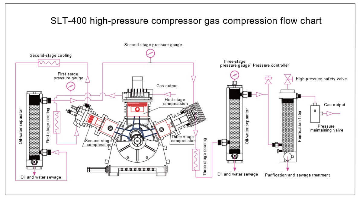 Этот продукт производится серийно после модернизации и оптимизации по итальянской конструкции. Поршень последней ступени изготовлен по специальной технологии, поршневые кольца изготовлены по японской технологии Riken, а все литьё производится на специализированных крупных заводах, что заслужило широкое признание пользователей. Этот продукт использует трёхцилиндровую систему, трёхступенчатую компрессию, систему смазки разбрызгиванием, межступенчатый предохранительный клапан и систему фильтрации. SLT-400 способен обеспечить безопасный сжатый воздух для любой отрасли, где требуется источник чистого воздуха высокого давления, гарантирующий безопасность дыхания.